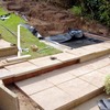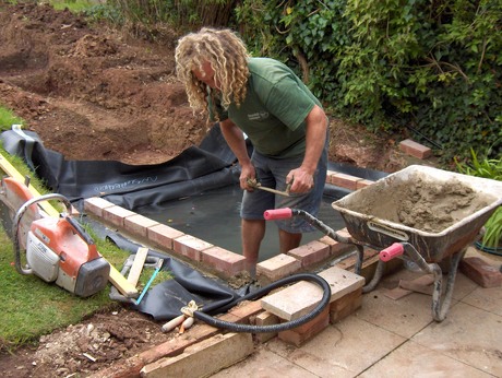 |   53 August 21st - A professional st work! Lee fits the liner under the bricks so it won't show - or get hot in the sun - and the slabs fit on top. |  |