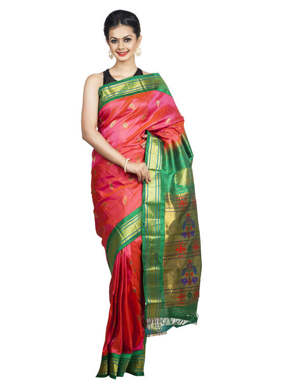 Two Tone Pink-Peach Paithani with Green Borders