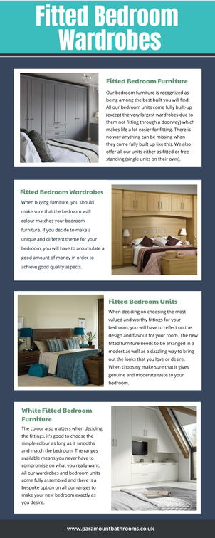 Find us on Google Map: https://goo.gl/maps/QYXguH9awV4q6Dkm7 Fitted Bedroom Wardrobes for modern homes and apartments mainly comprises a lot of things like a bed, cabinets, wardrobe, a nightstand, and the last one is the magnet bedroom furniture for the home. Paramount Bathrooms Our Profile : http://www.23hq.com/paramountbathrooms More Info-graphic ​Distribution : |