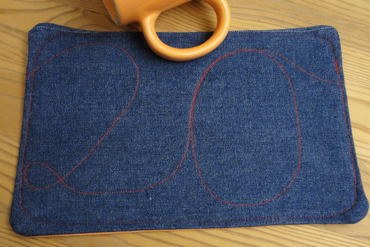 Mug Rug / Tassenteppich Ikea fabric on one side, / Ikea-Stoff auf der einen, denim on the other. / Jeansstoff auf der anderen Seite. |