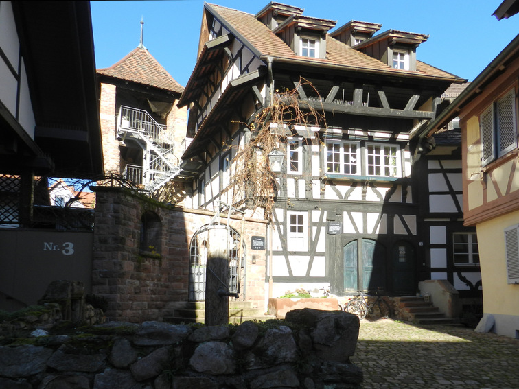 Gengenbach, der Turm hinten ist ein Teil der Stadtmauer, im Vordergrund eine hölzerne Wasserpumpe
