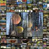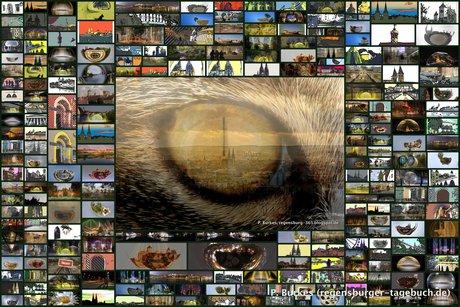 Collage mit experimentellen Bildern. Inder Mittel ein Foto von Fritzis Katzen-Auge, kombiniert mit einem Foto von Regensburg von Keilberg aus.