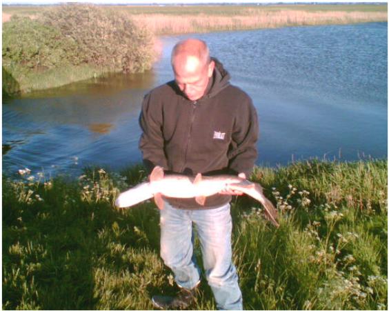 Gedde ganget d. 17 maj, 85 cm, fanget ved starten på Den gamle Åslynge - midt i strømløbet. Mit fangstnet var for lille, så godt jeg havde Claus Julius med. Han har reddet mig før.