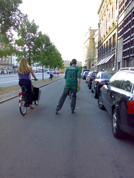 "Schnell" - A guy on his way to a skate-gathering has the german word for "fast" written on the back of his t-shirt :)
