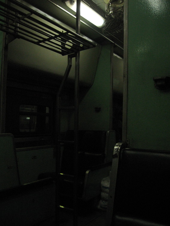 Inside a sleeper train before the beds come down.