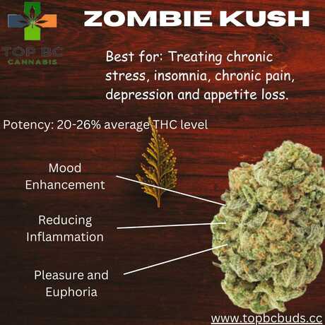 Looking for the Zombie Kush weed for treating various medical condition? Visit Top BC Cannabis online to buy this top quality weed strain in Canada. Zombie Kush is a cannabis strain known for its potent and relaxing effects. It's an indica-dominant hybrid with a distinct earthy and skunky aroma. Users report a strong body high and a calming, sedative experience, making it popular for relaxation and pain relief. |