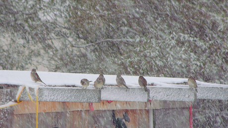 House Sparrows out in the snow storm.